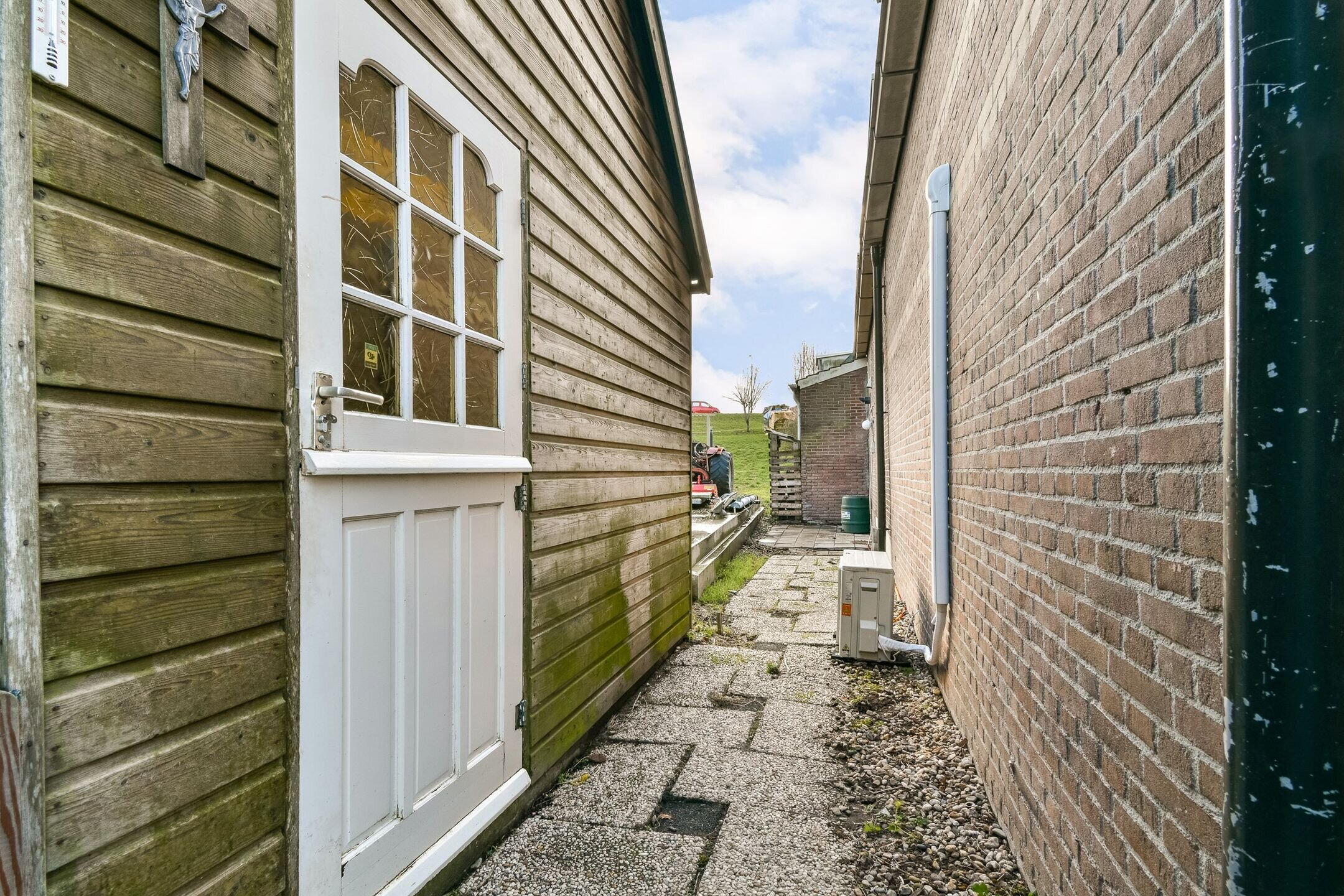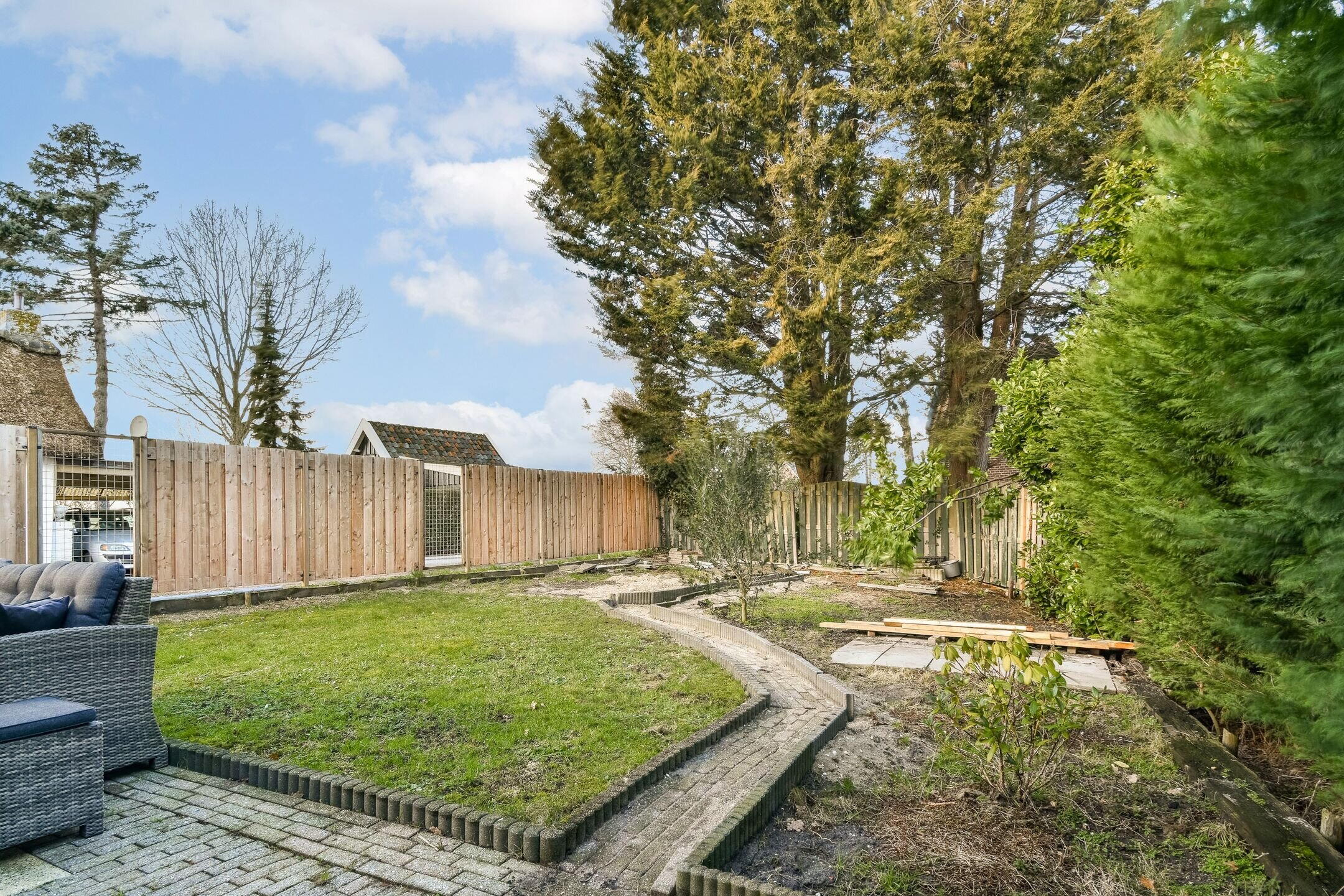 Achter de woning bevindt zich het tweede perceel. Hier staat de houten, vrijstaande berging van ca 11 m² met vliering.
