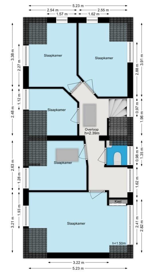Er zijn twee gescheiden bergvlieringen. Allebei met een nokhoogte van ca. 0,80 m.