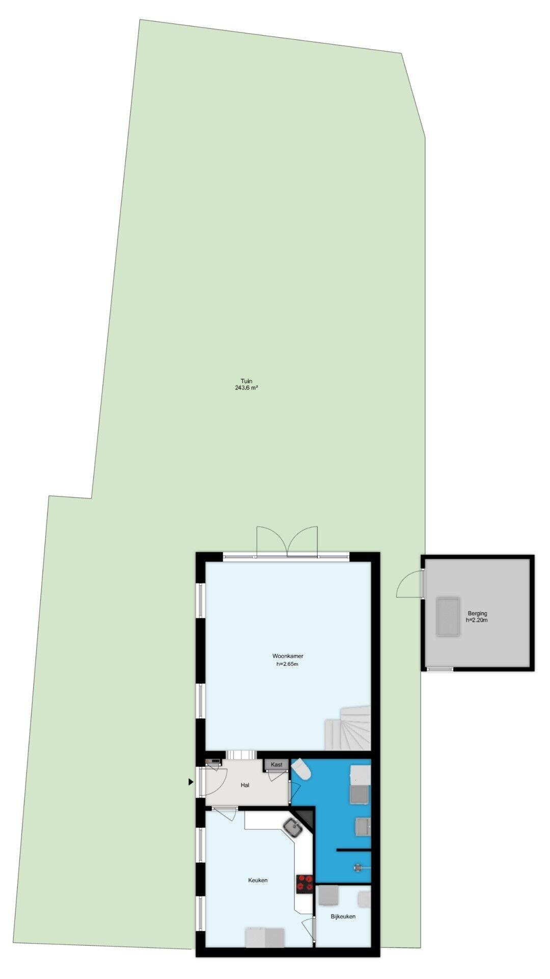 Entree in de ruime en lichte hal met meterkast, vaste kast en garderoberuimte. Via een toog bereik je de royale woonkamer (ca. 30 m²). Dit is het gedeelte dat in 1992 is aangebouwd. De woonkamer is voorzien van airconditioning, openslaande deuren naar de hoofdtuin en een open trap naar de eerste verdieping. De woonkeuken bevindt zich aan de straatzijde en biedt meer dan genoeg ruimte voor een grote en sfeervolle eethoek. De riante keuken in L-opstelling is uitgerust met vele kasten en laden en biedt een kookplaat, vaatwasser, koelkast, oven en magnetron. Aansluitend vind je de bijkeuken en technische ruimte met de CV-installatie en ruimte voor (proviand)opslag. De moderne badkamer is uitgerust met een toilet, wasmeubel, een ruime inloopdouche, de witgoedaansluitingen en mechanische ventilatie.